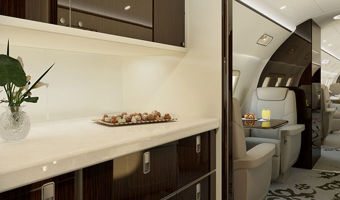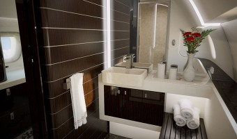 The Lineage 1000 is largely based on the Embraer 190 passenger jet. The greatest change in the Lineage 1000 is the extra fuel tanks in the cargo hold, which nearly double the jet’s range. The jet’s lavish interior is divided into sections, including an optional bedroom, washroom with running water and a walk-in cargo area at the rear.